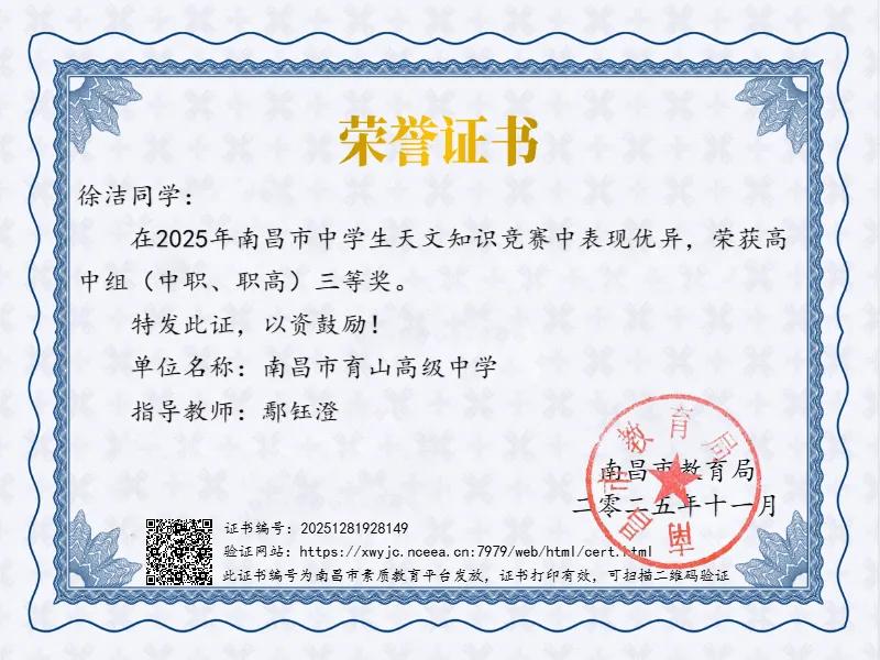 热烈祝贺我校尧君至、李君昊、徐洁三位同学在2025年南昌市中学生天文知识竞赛中斩获佳绩!